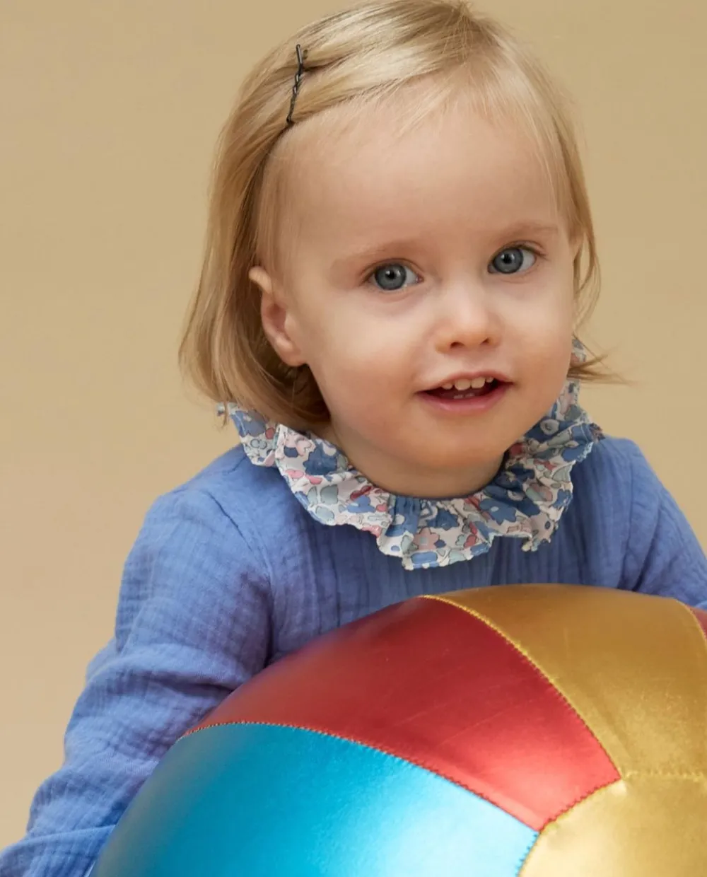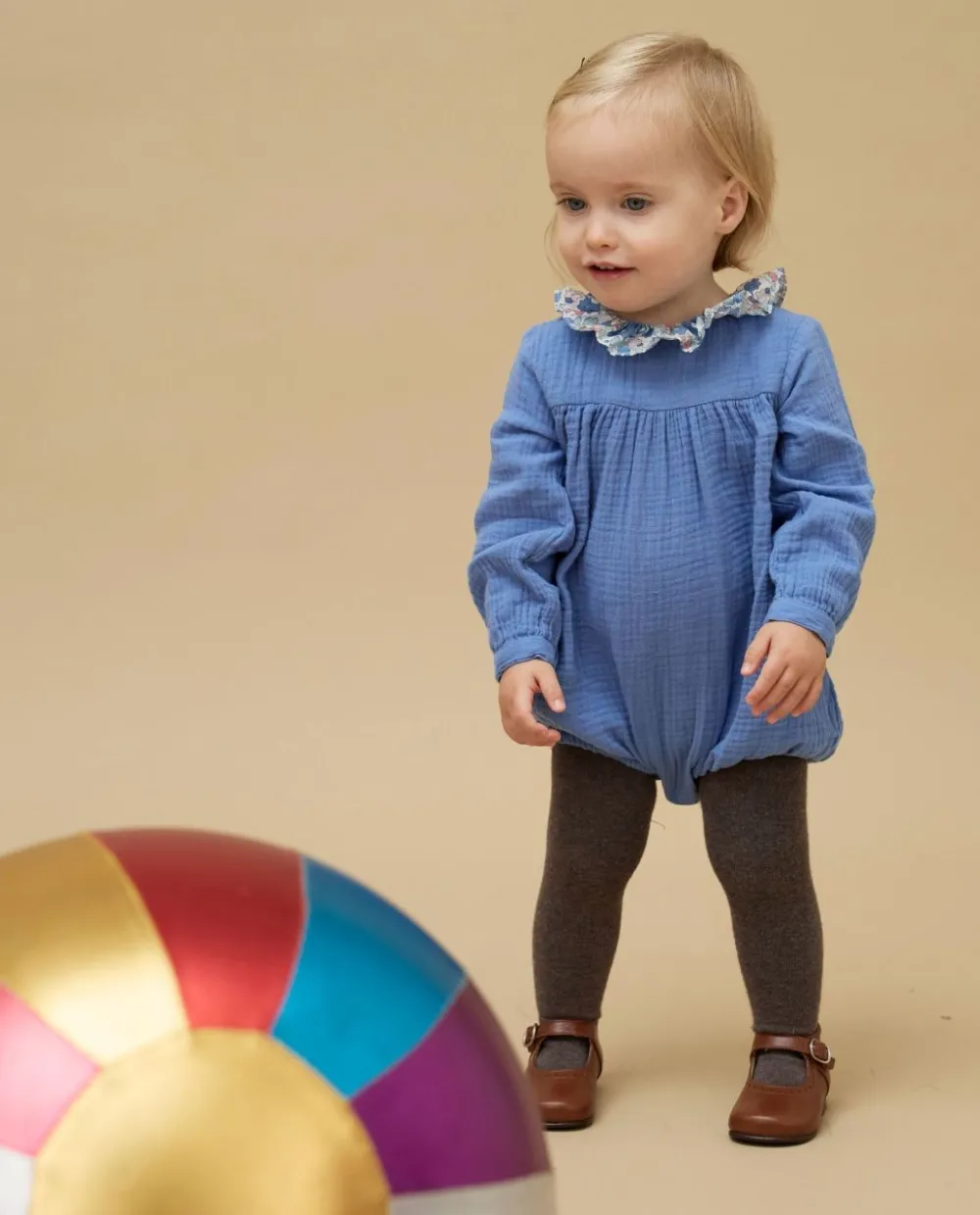 Barboteuse en double gaze de coton. Encolure ronde avec un volant en tissu Liberty. Boutonnage dos. Manches longues. Boutons pression à l’entrejambe. Buste doublé.100% coton.