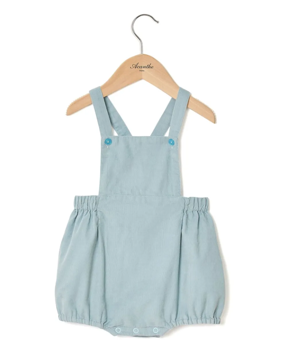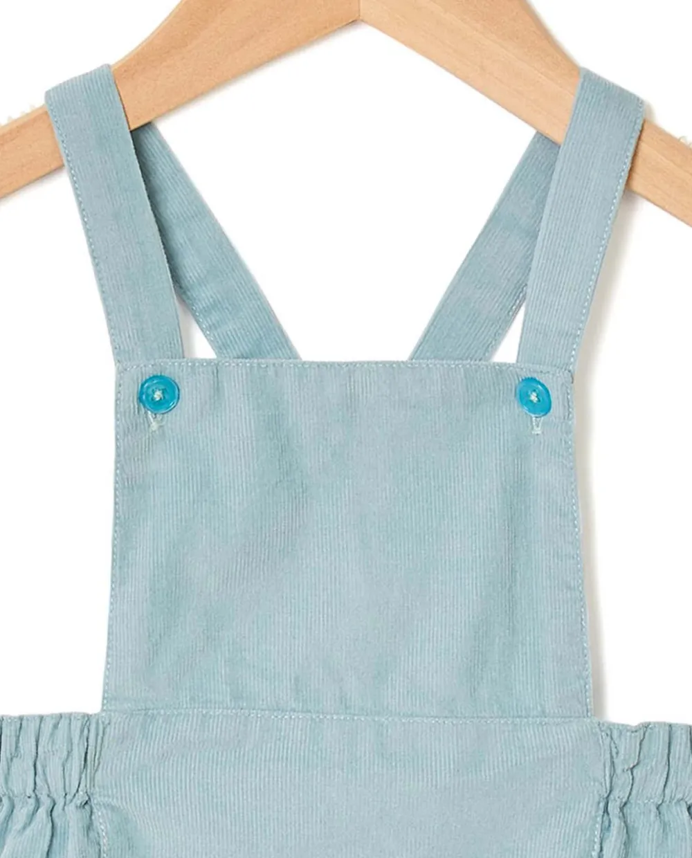 Culotte bouffante en velours. Bas de jambe élastiqué. Bretelles croisées au dos se boutonnant devant dans la bavette. Pur coton.