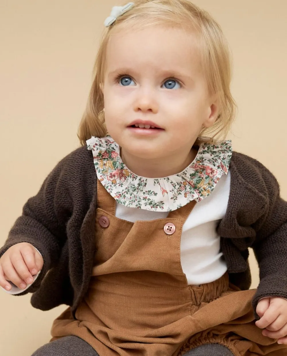Body manches longues en pur coton. Patte boutonnée au dos. Entrejambe pressionné. Petit col volanté en tissu Liberty. 100% coton.