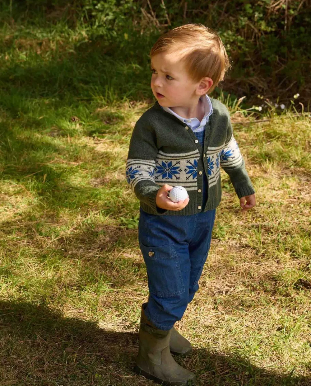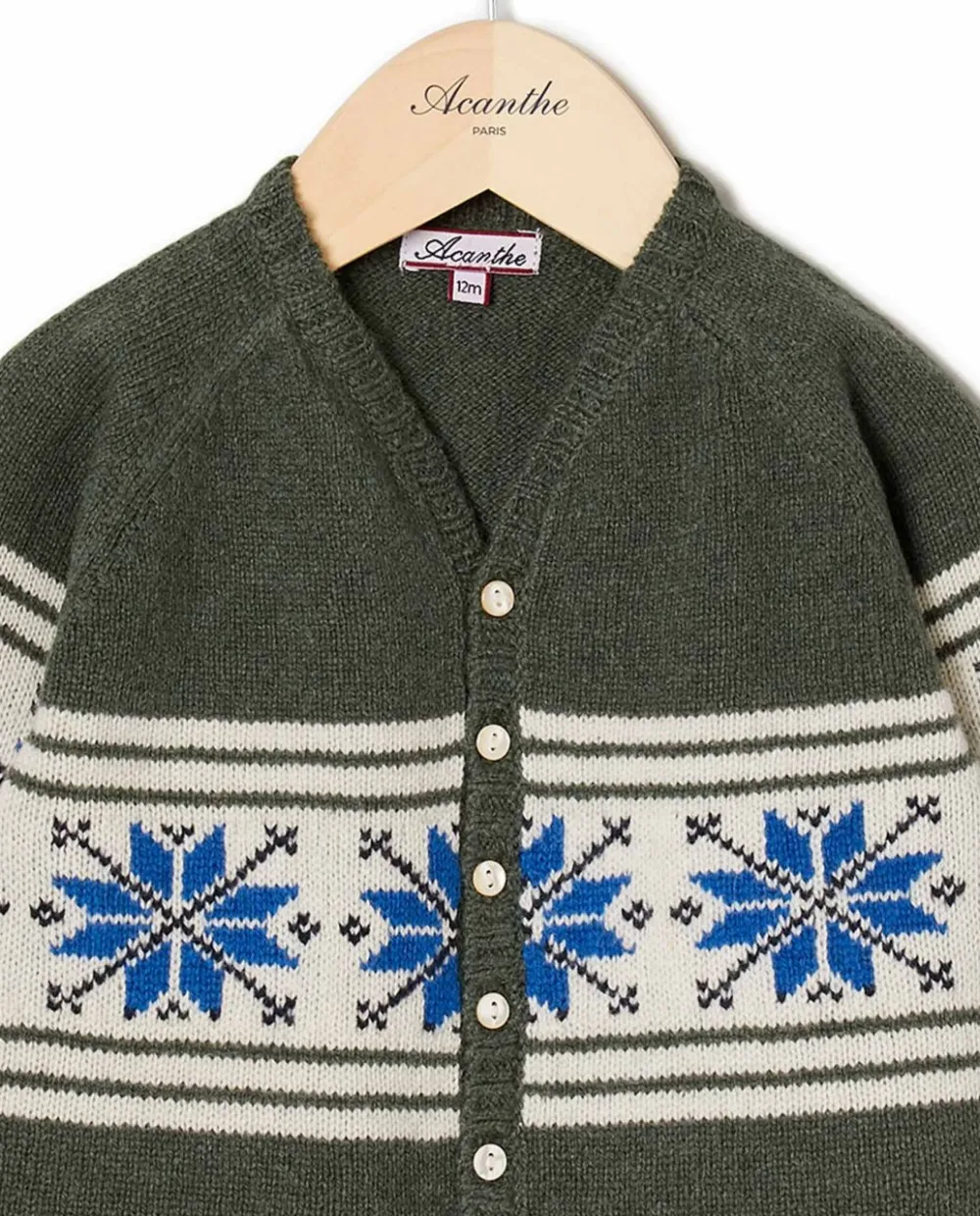 Cardigan jacquard. Fermé par des petits boutons nacre milieu devant. Finition bord-côtes. Pure laine d’agneau.