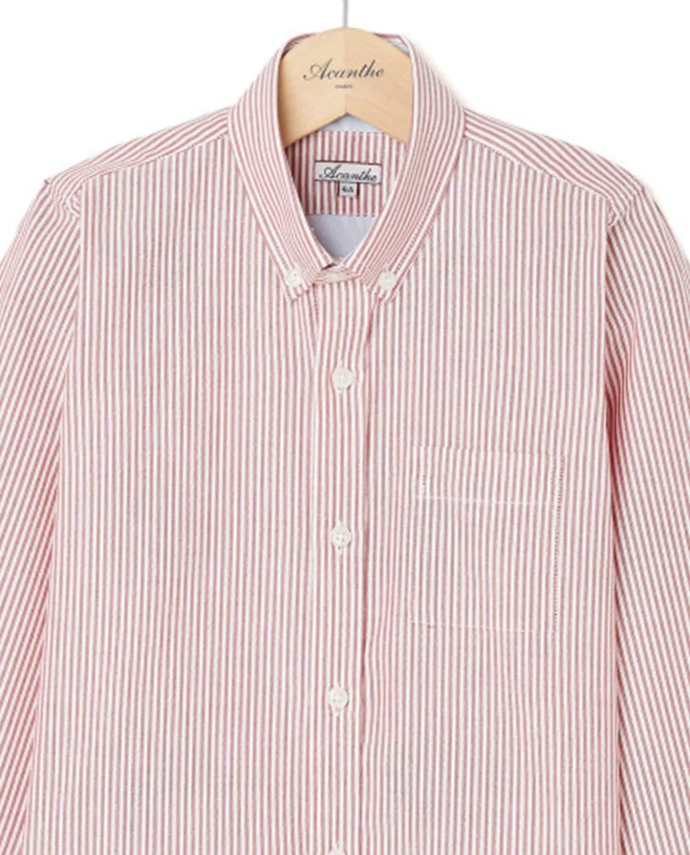 Chemise garçon en oxford rayé. Manches longues. Poche poitrine. Empiècement dos avec pli rond. Pans arrondis au bas.