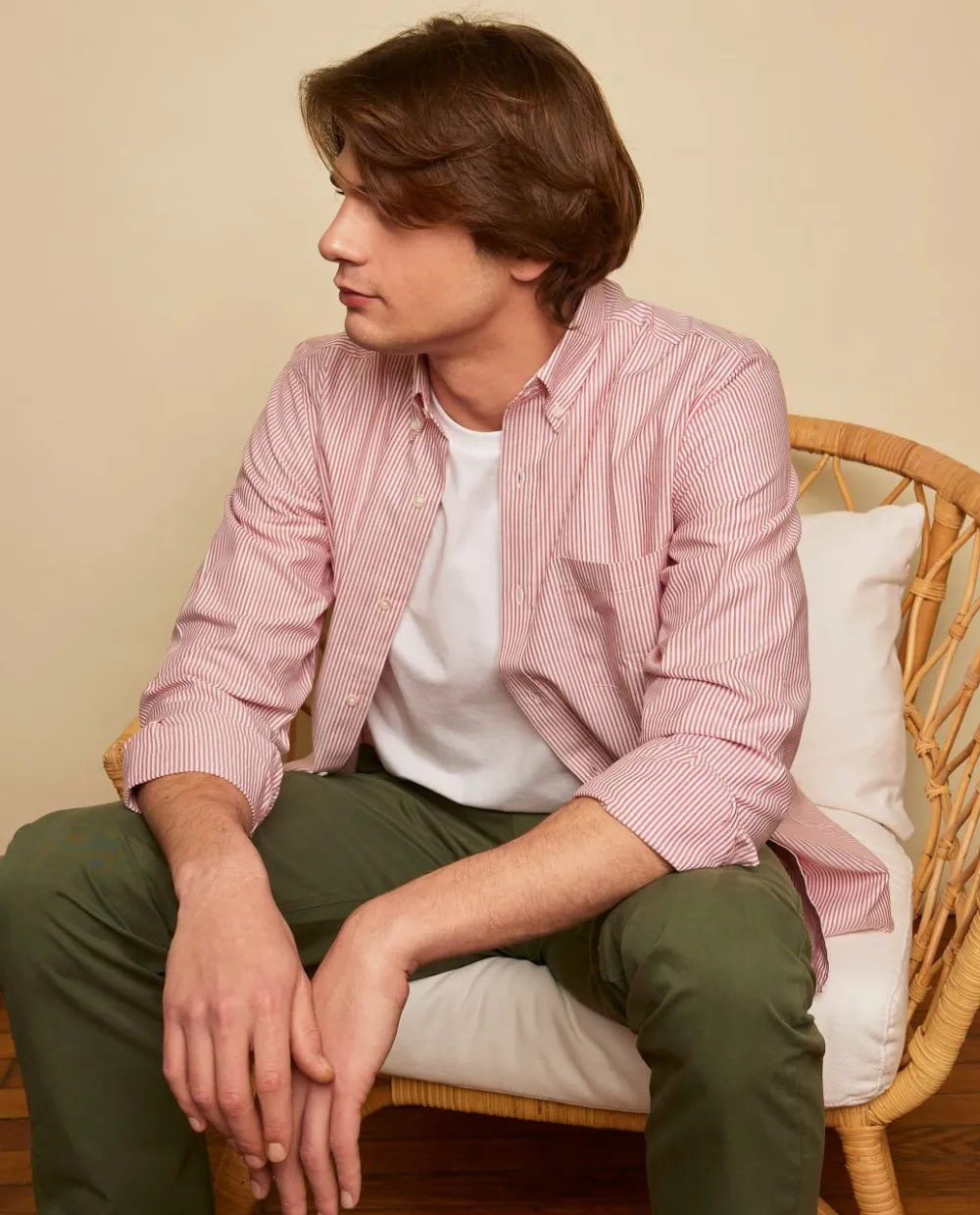 Chemise homme 100% coton. Col boutonné, manches longues. Poche poitrine. Empiècement dos avec pli rond, pans arrondis au bas. Le mannequin mesure 1m95 et porte une taille xl.