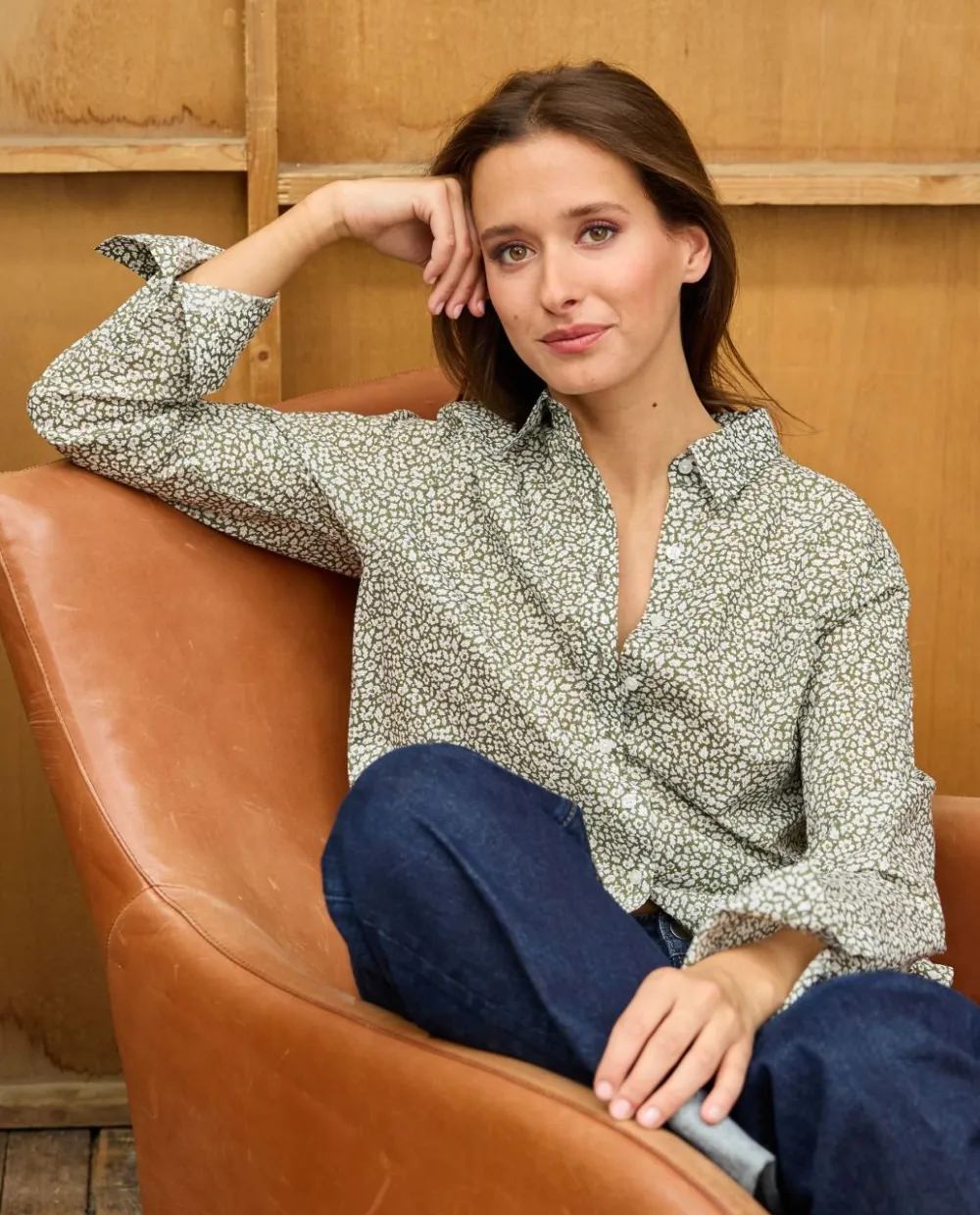 Chemisier classique manches longues en tissu Liberty. Pli rond au dos. Le mannequin mesure 1m75 et porte une taille 1. 100% coton.