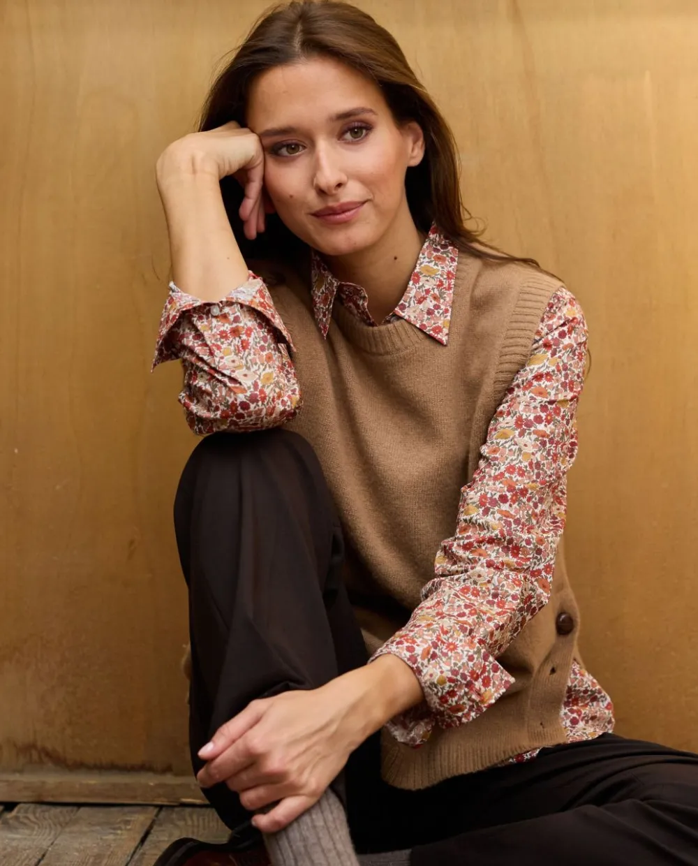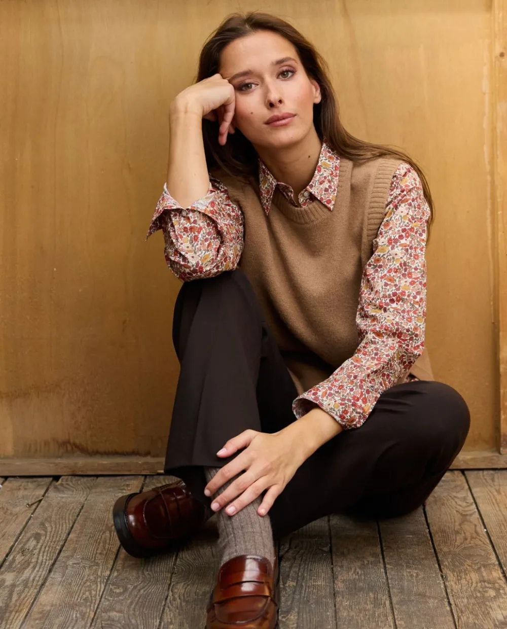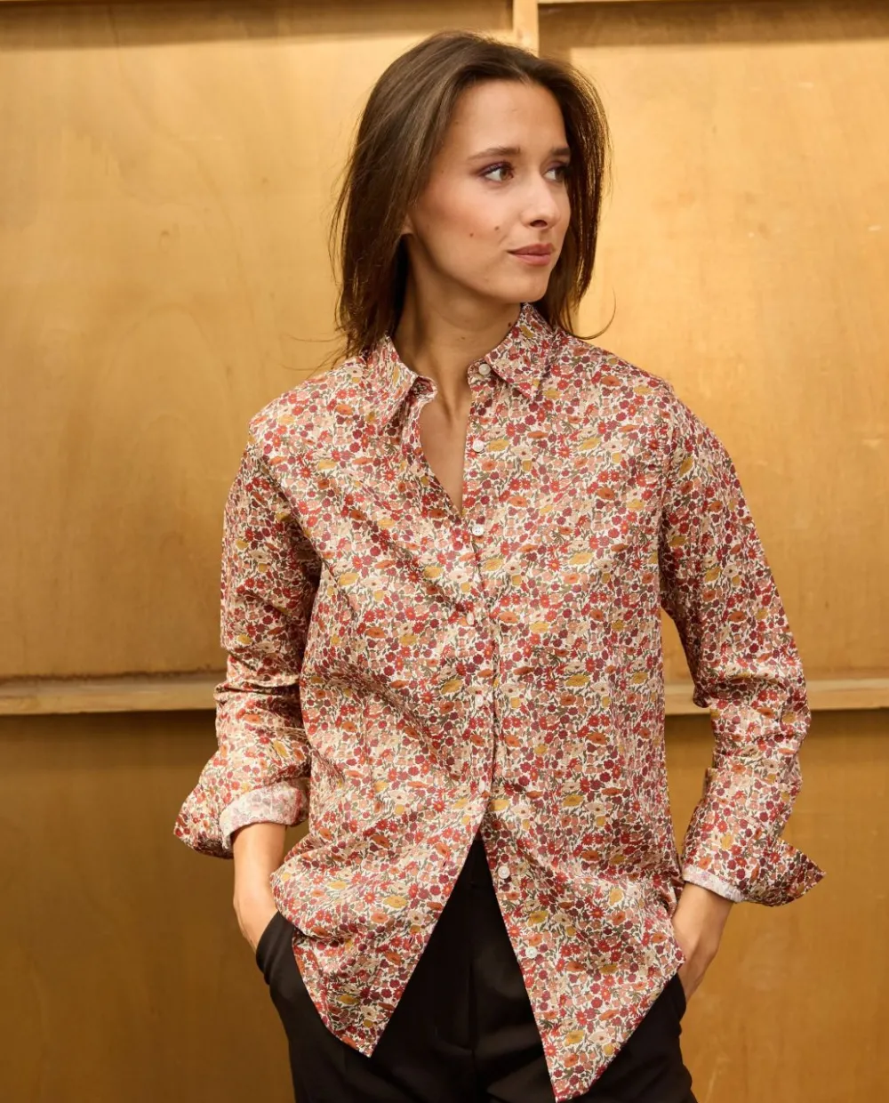 Chemisier classique manches longues en tissu Liberty. Pli rond au dos. Le mannequin mesure 1m75 et porte une taille 1. 100% coton.