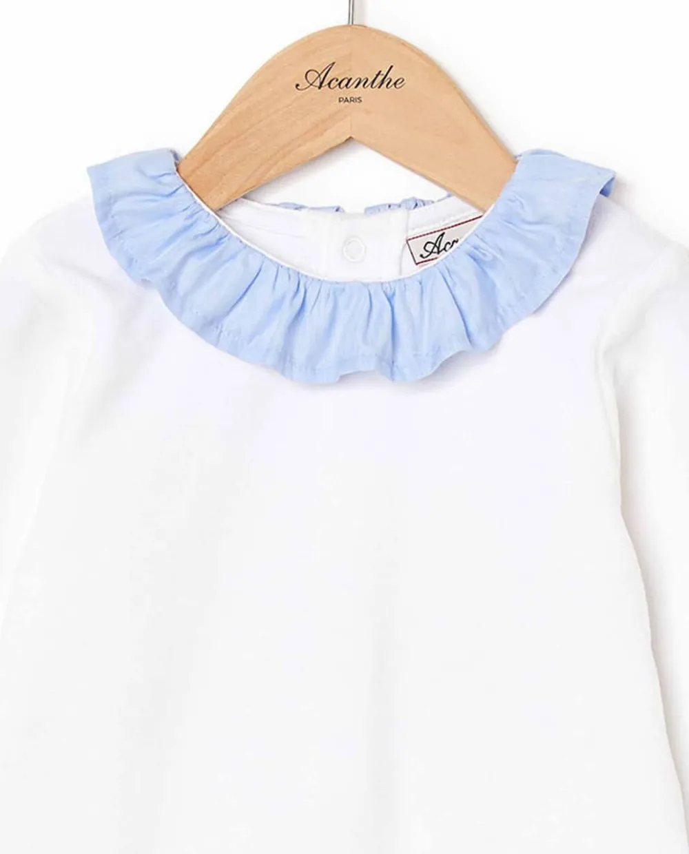 Pyjama bébé en velours éponge. Petit col volanté en popeline. Ouverture dos pont pressionné.