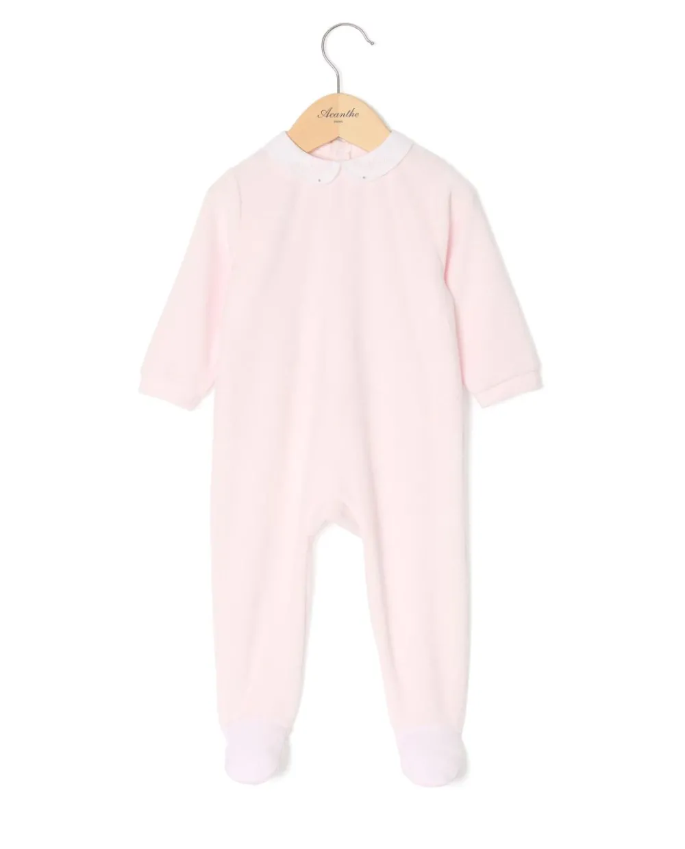 Pyjama bébé en velours éponge rose, col rond brodé et ouverture dos pont pressionné.
