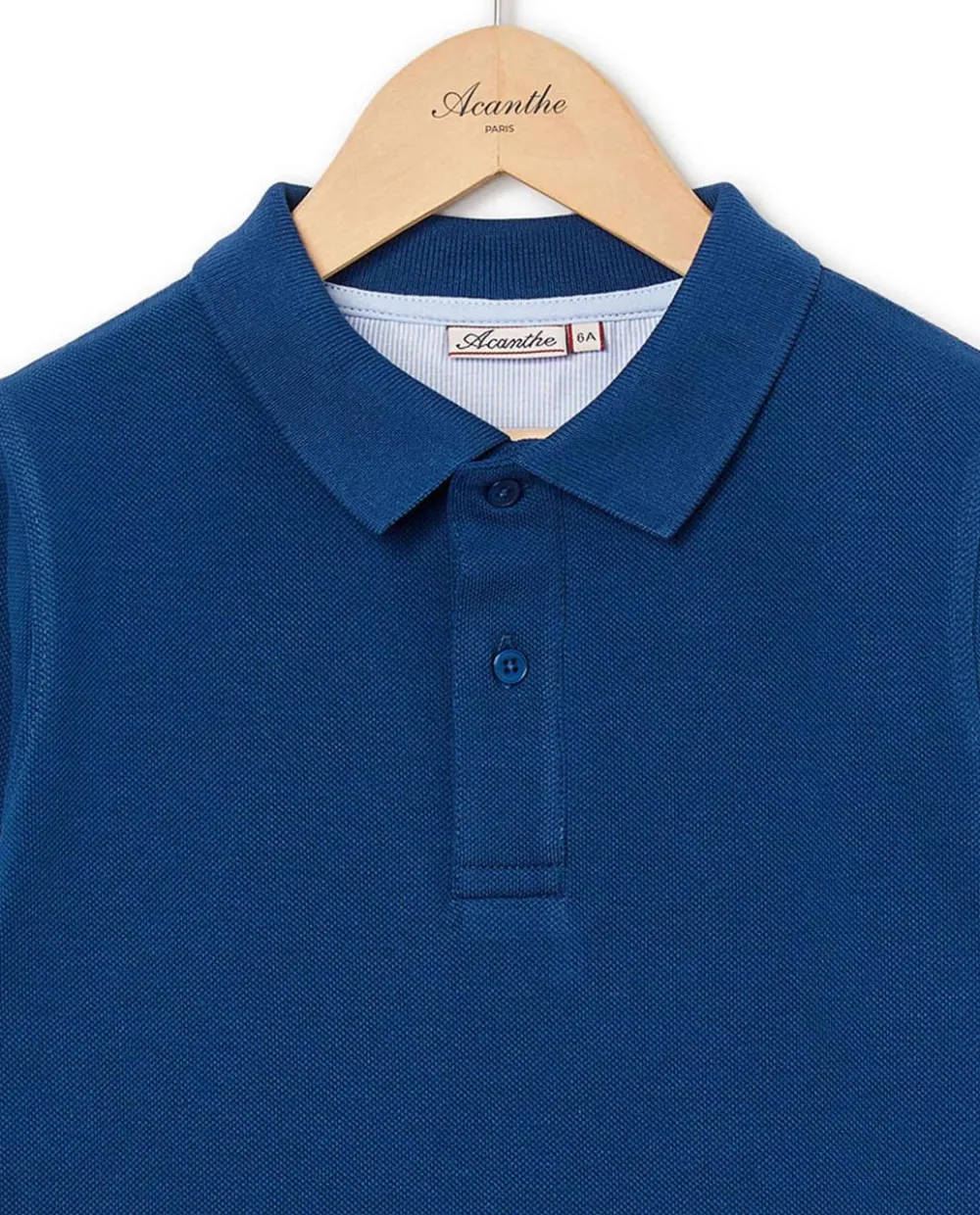 Polo en maille piquée pur coton. Manches longues. Col polo en côtes. Empiècement à l’intérieur sous l’encolure en popeline rayée. Fentes aux côtés.