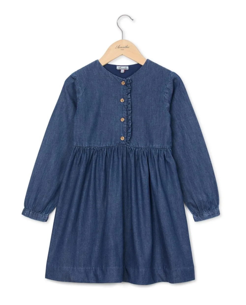 Robe en denim. Manches longues resserrées par un bracelet boutonné. Boutonnage et petit volant sur le buste.100% coton.