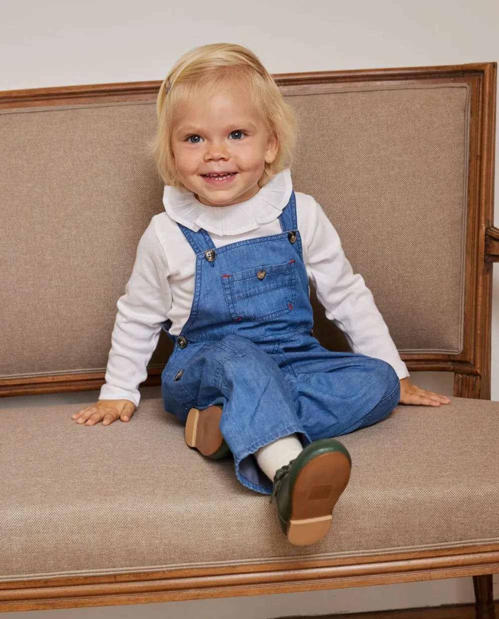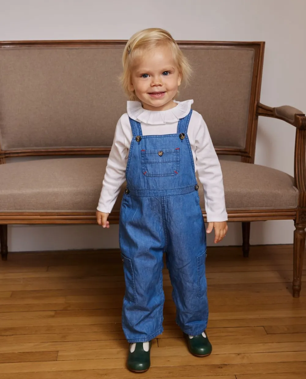 Salopette longue en denim. Bretelles boutonnées. Ouvertures côtés et pressions à l’entrejambe. Poche sur la bavette. Doublure en toile de coton. 100% coton.