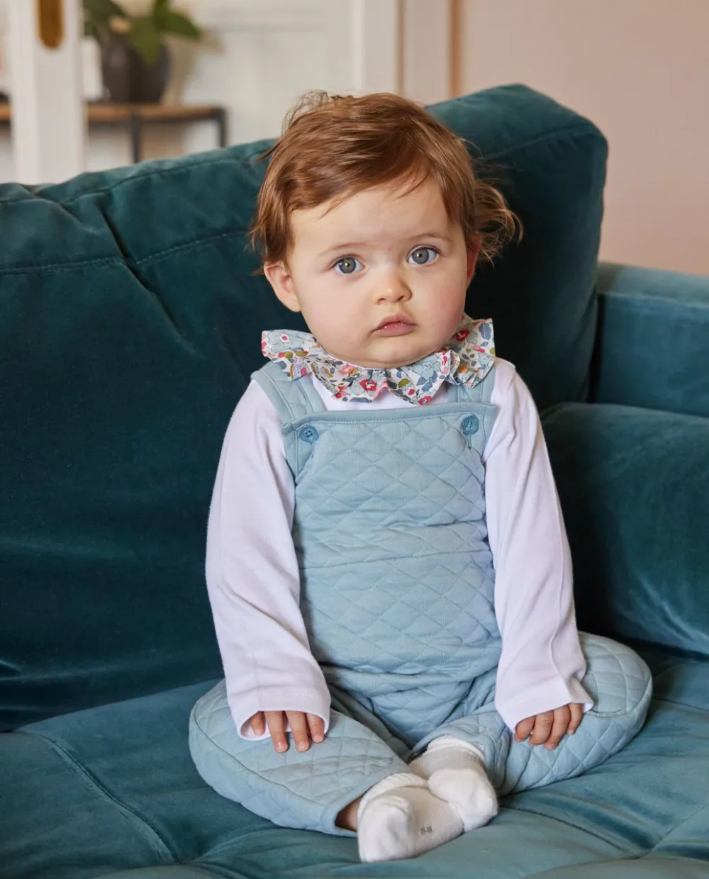 Bretelles boutonnées. Boutons pression à l’entrejambe. Poches plaquées devant.
