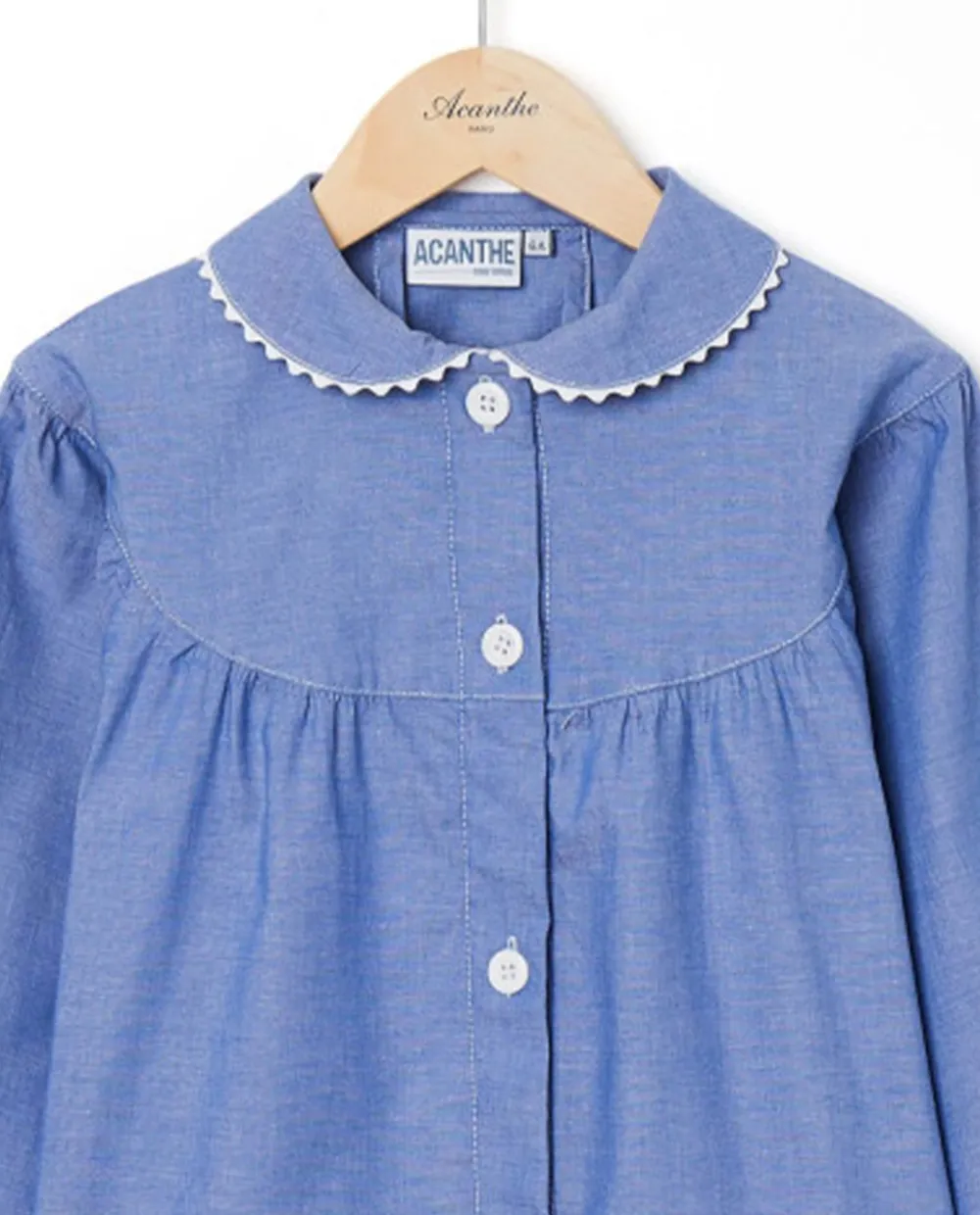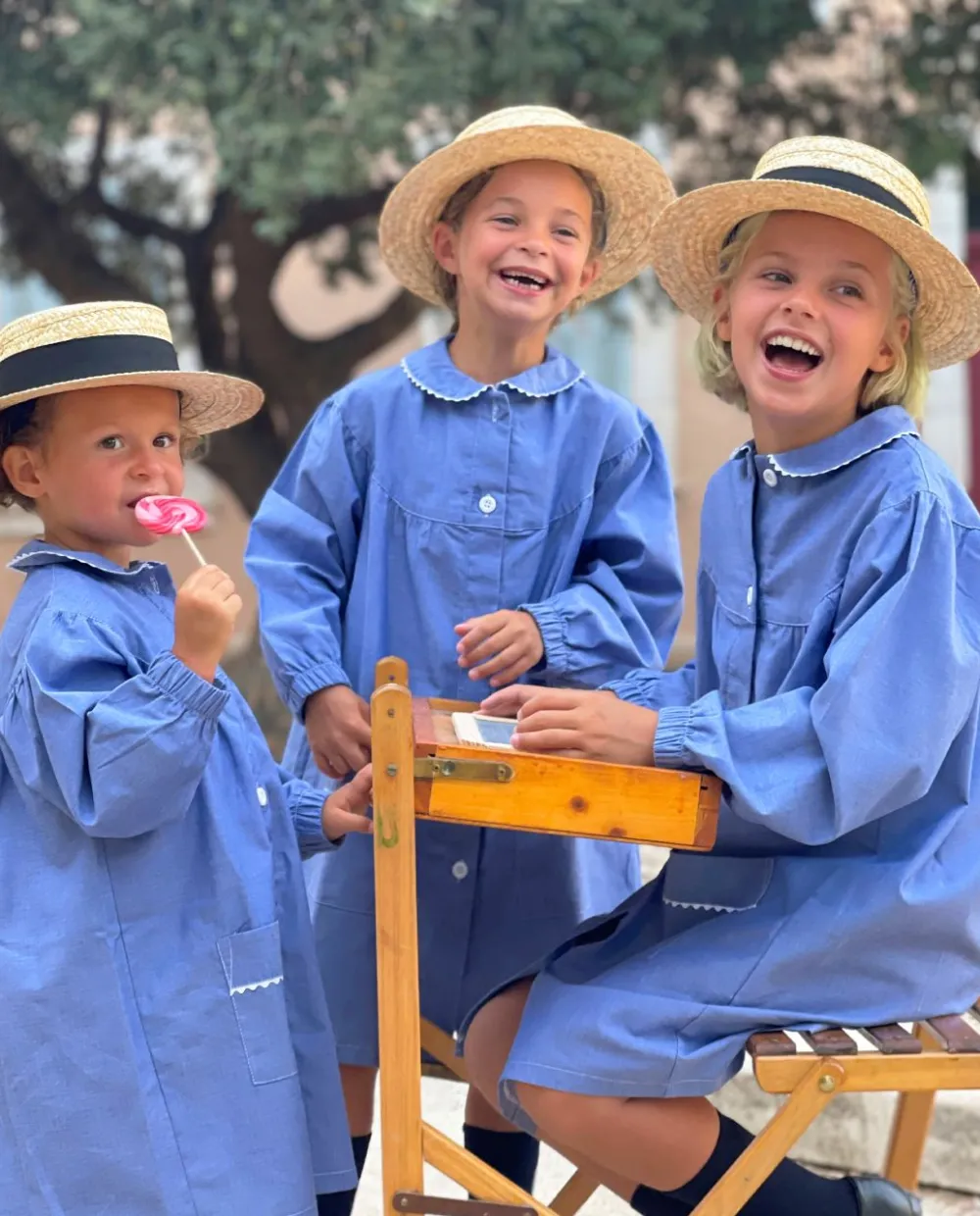 Tablier fille col claudine, boutonne devant, poignets elastiques et poches plaquees. Fintion croquet.