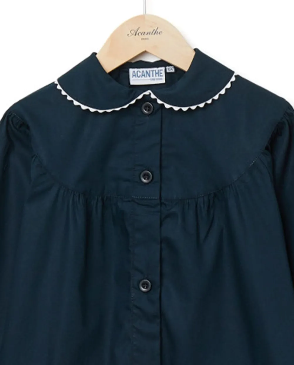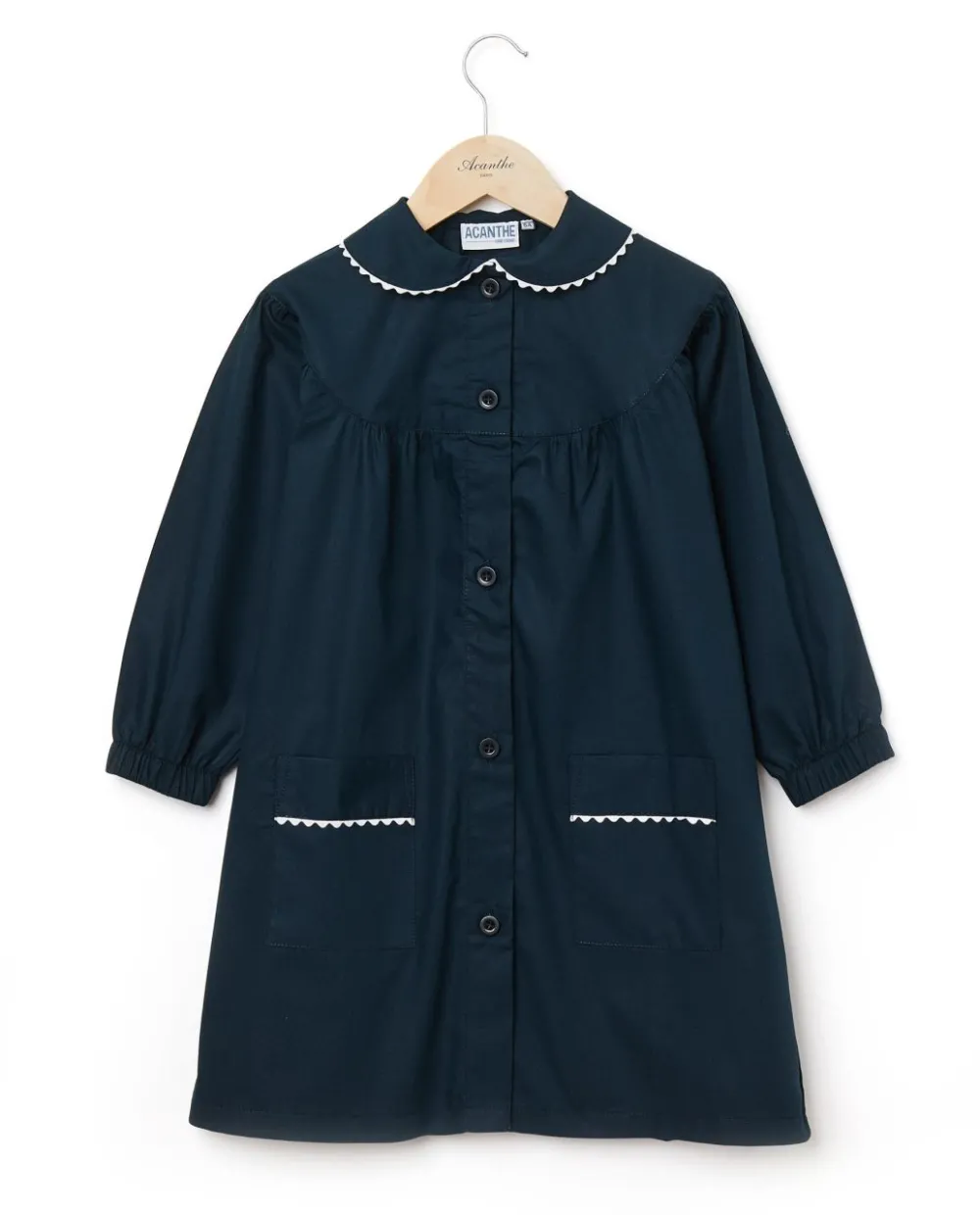Tablier fille col claudine, boutonne devant, poignets elastiques et poches plaquees. Fintion croquet.