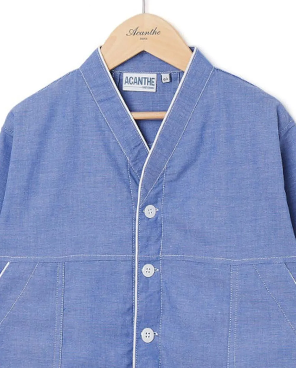 Tablier garcon encolure V, boutonne devant, poignets elastiques et poches plaquees. Finition passepoil.