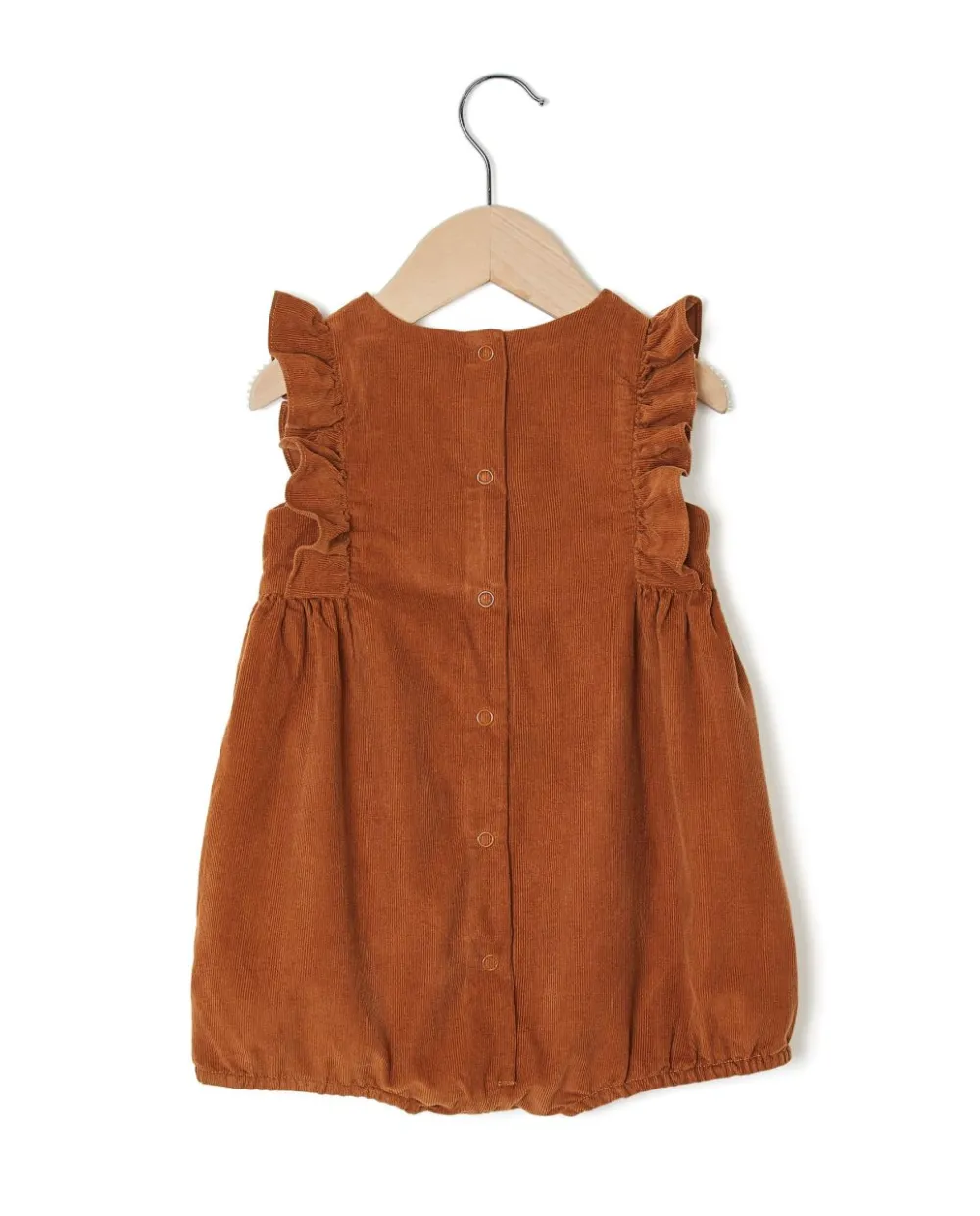 Barboteuse sans manche entièrement doublée. Volants de chaque côté. Boutonnée au dos. Boutons pression à l’entrejambe. Pur coton.