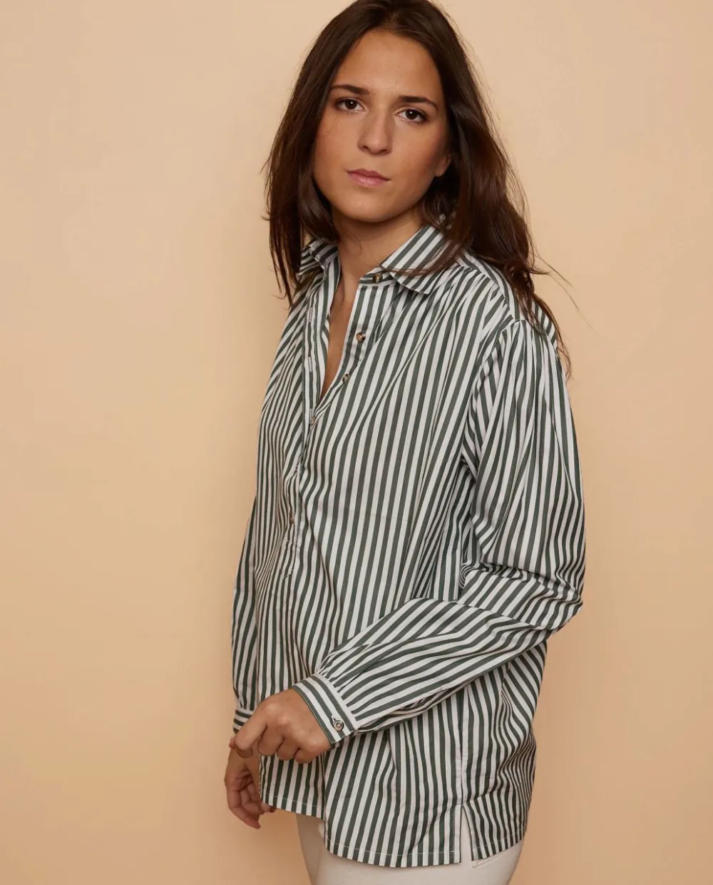 Blouse en flanelle de coton. Manches longues légèrement bouffantes. 1/2 patte de boutonnage devant. Fronces sous empiècement devant et dos.
