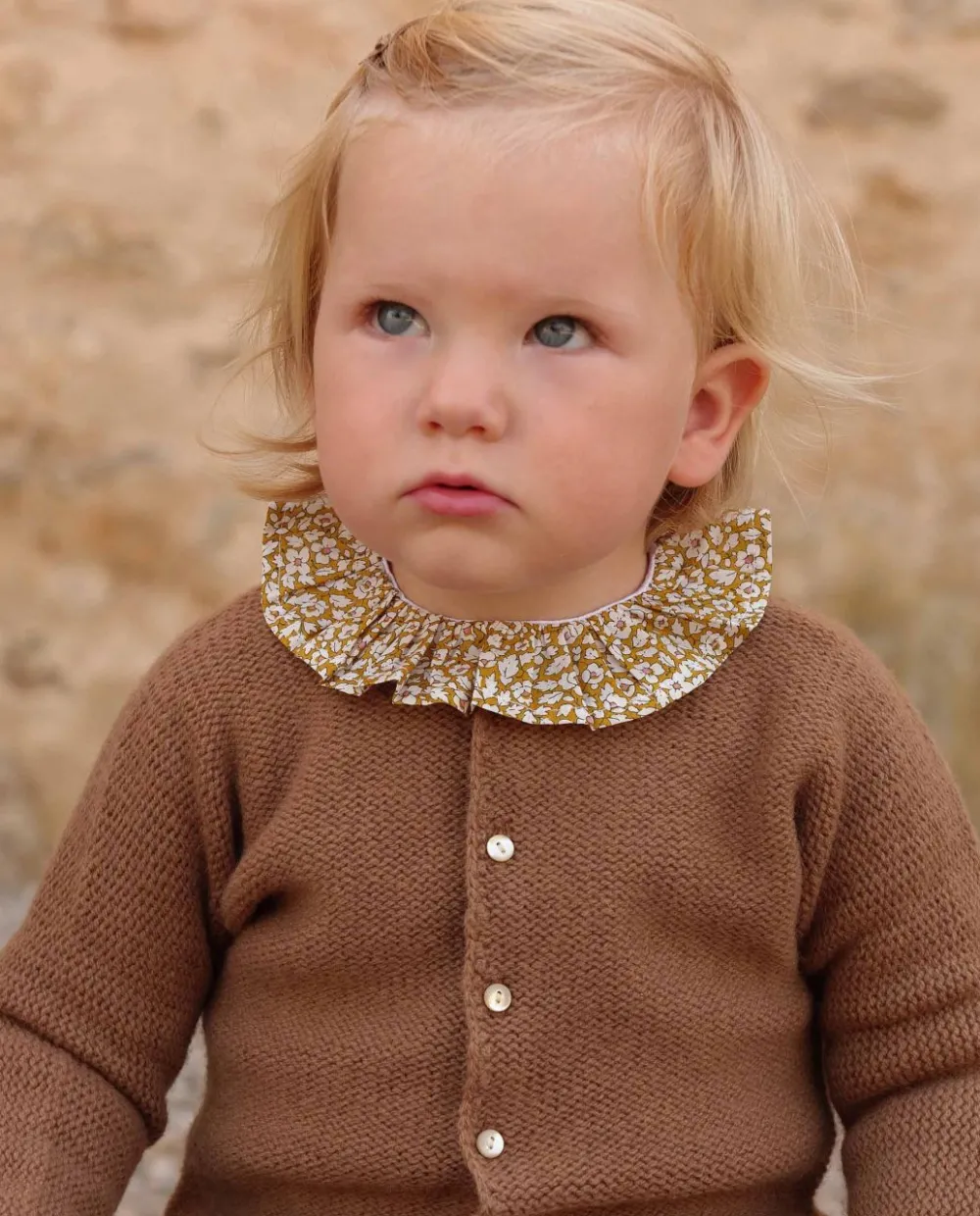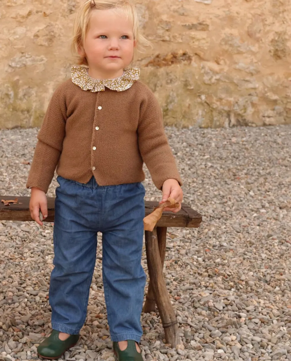 Cardigan point mousse bébé (jersey envers). Boutonné au milieu devant. Emmanchure kimono. Pure laine d’agneau.