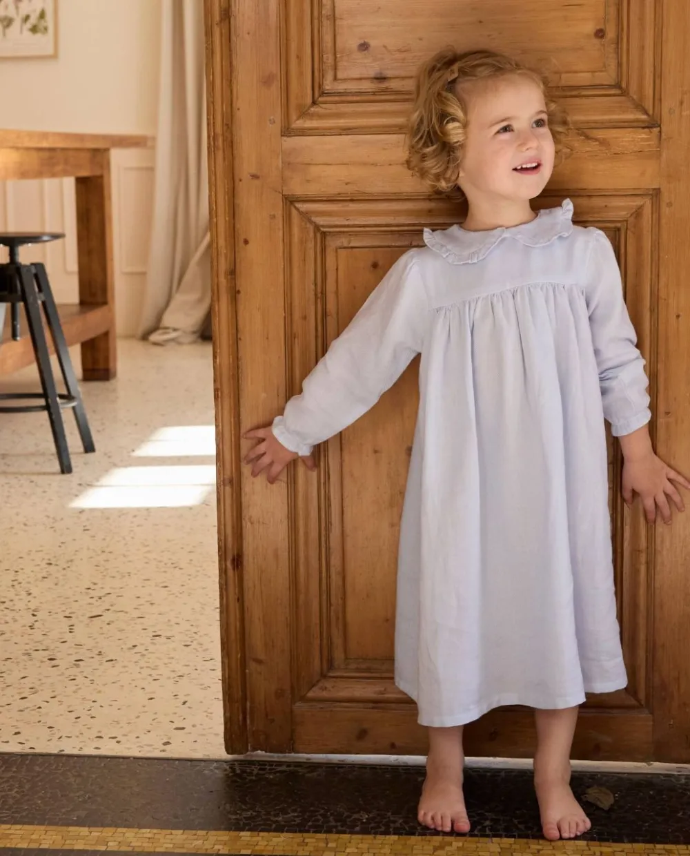 Col claudine, taille haute et manches longues bouffantes resserrées au bas par un élastique. 100% coton.