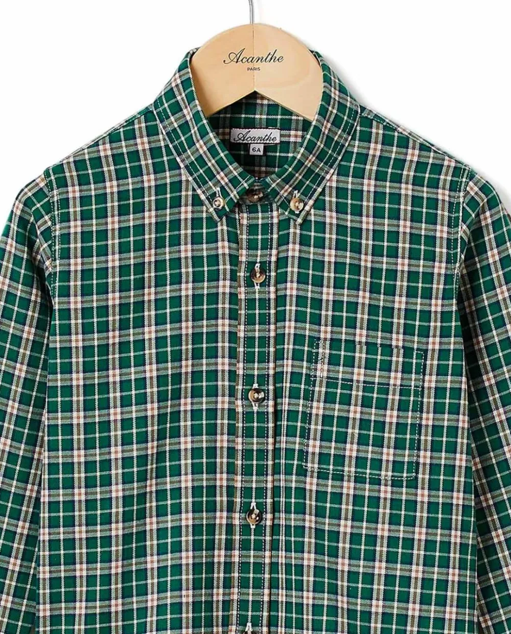 Chemise garçon. Manches longues. Poche poitrine. Pans arrondis au bas.