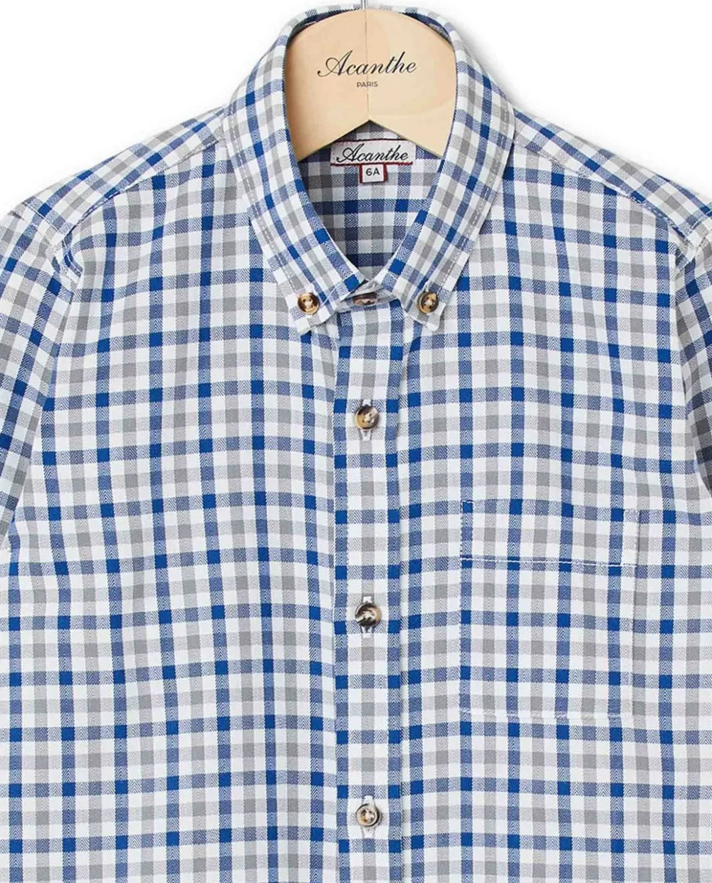 Chemise garçon. Manches longues. Poche poitrine. Pans arrondis au bas.