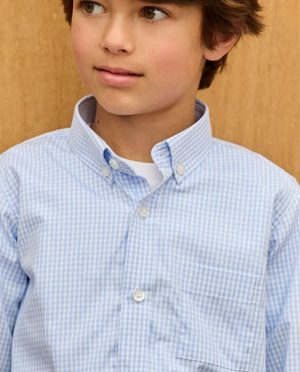 Chemise garçon. Manches longues. Poche poitrine. Pans arrondis au bas. 100% coton.