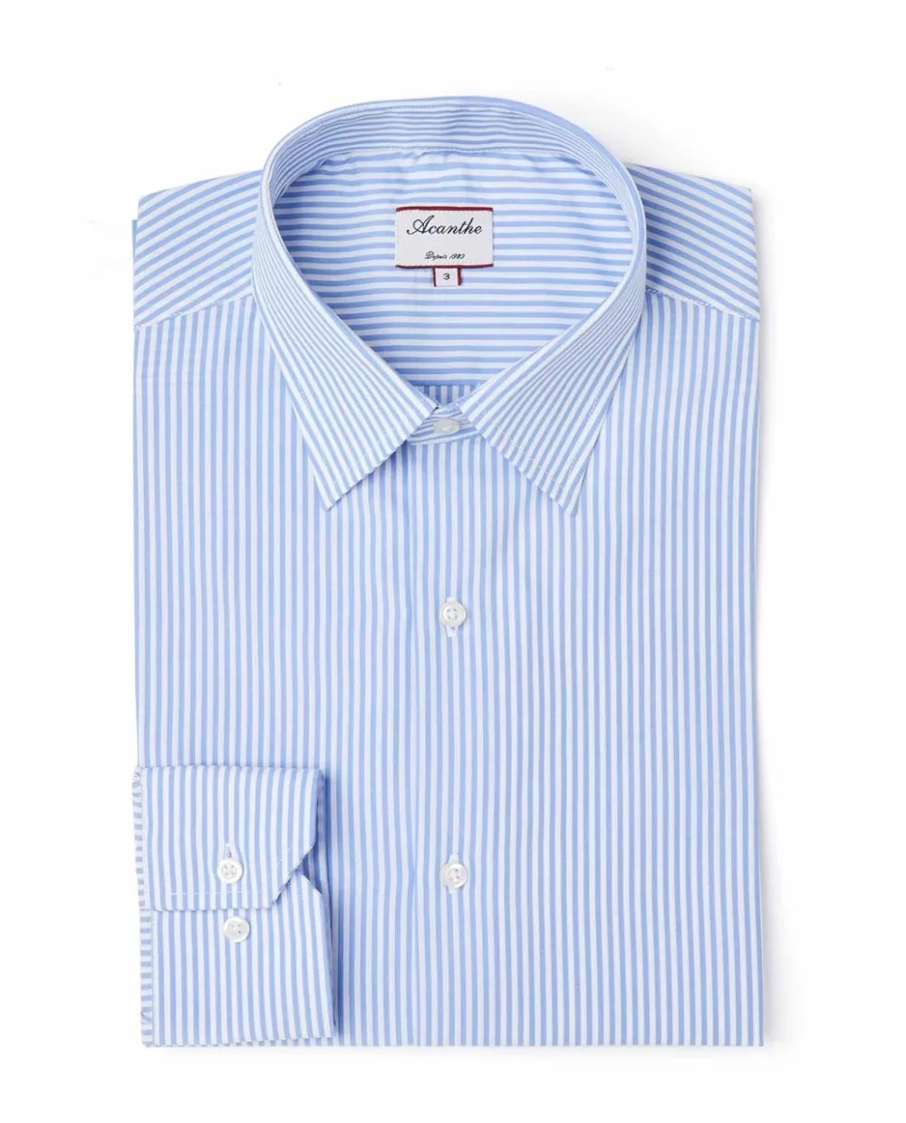 Chemise col italien. Manches longues. 2 plis souples carrure dos. Pans arrondis au bas.
