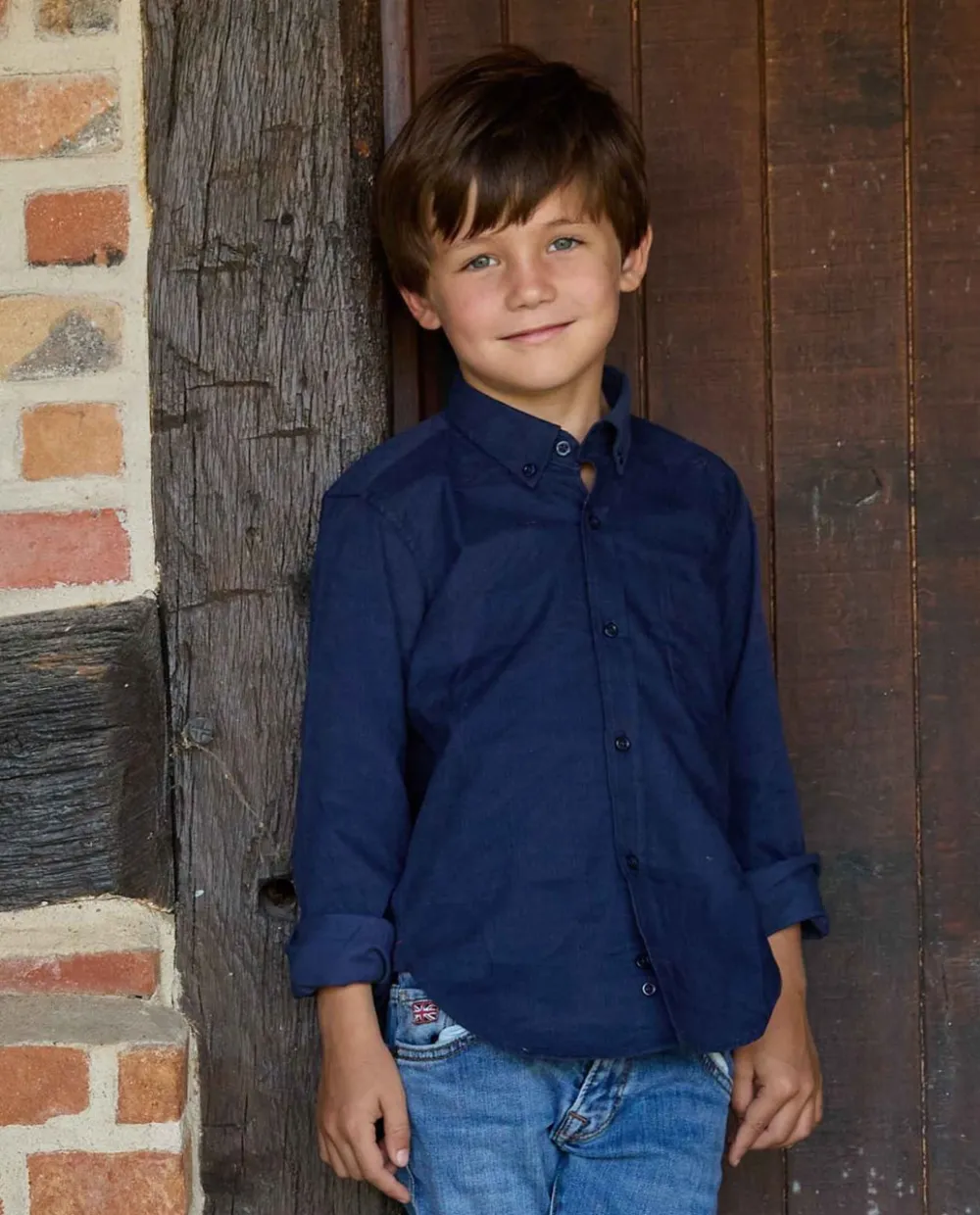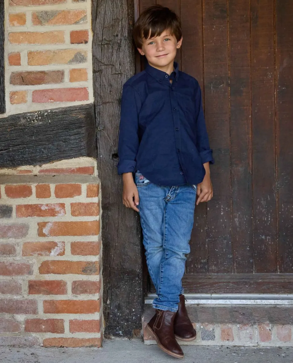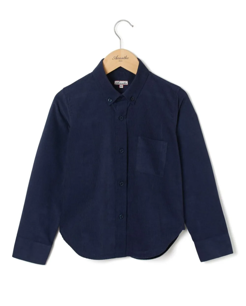 Chemise garçon. Manches longues. Poche poitrine. Pans arrondis au bas.