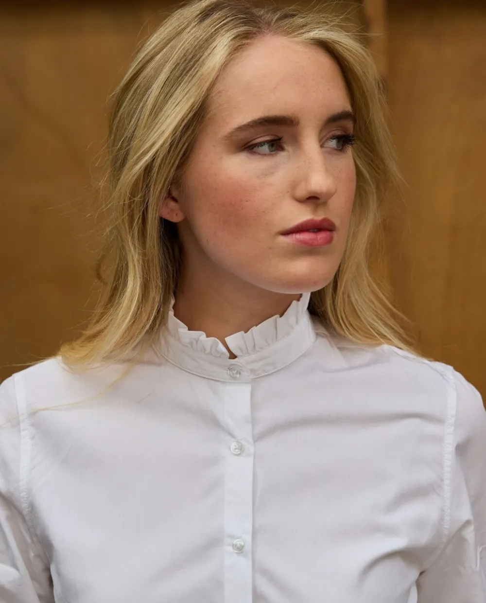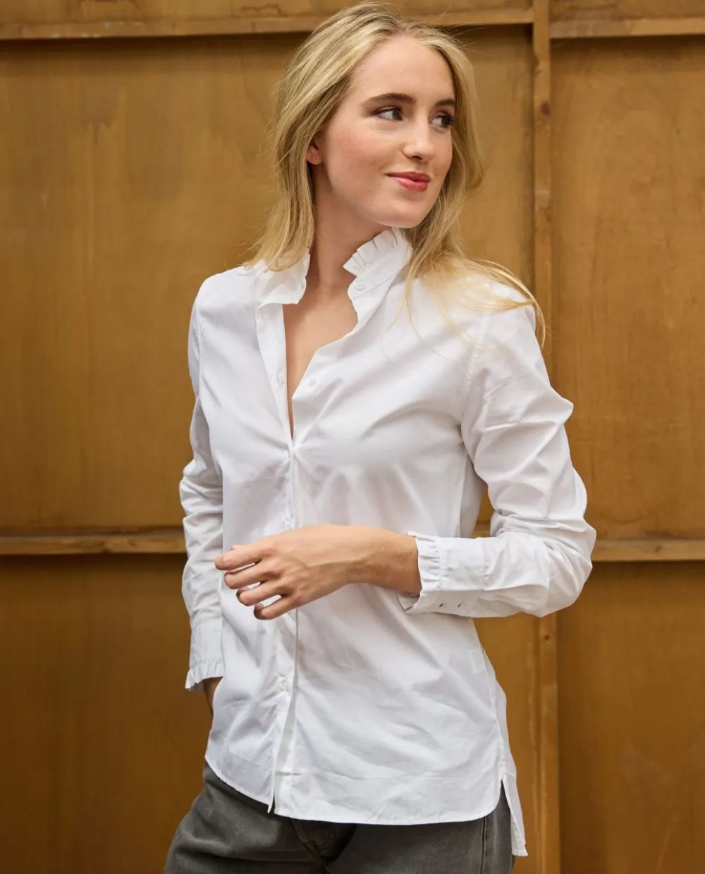 Chemisier manches longues avec petit volant au col et aux poignets. Le coton est une fibre végétale, hypoallergénique. Cest une matière avec un bon pouvoir absorbant et isolant : il supporte bien la