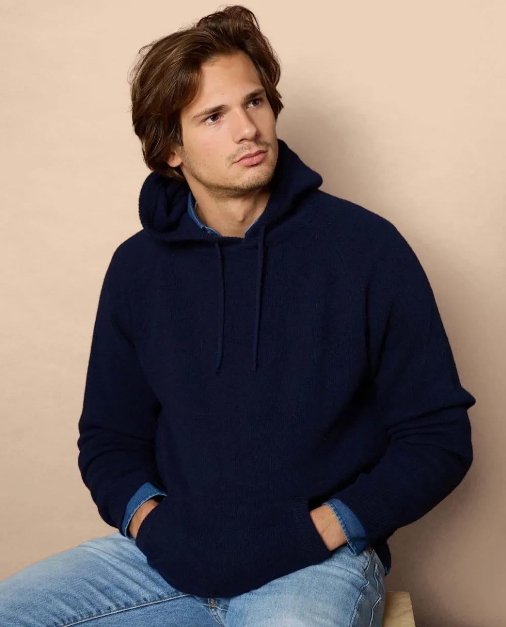 Pull à capuche. Poche au devant. Finition bord-côtes. Laine 90 mérinos/10 cachemire.