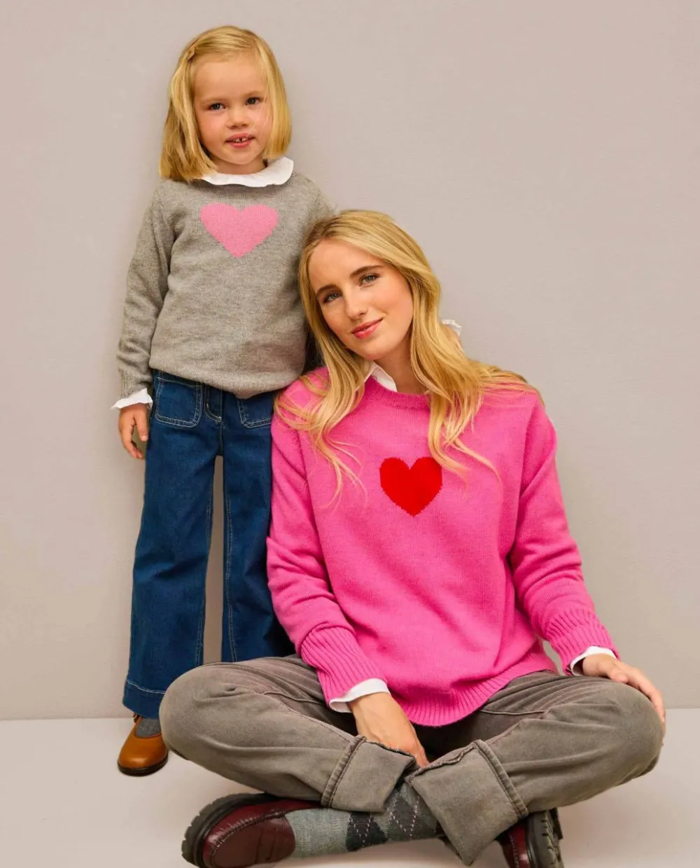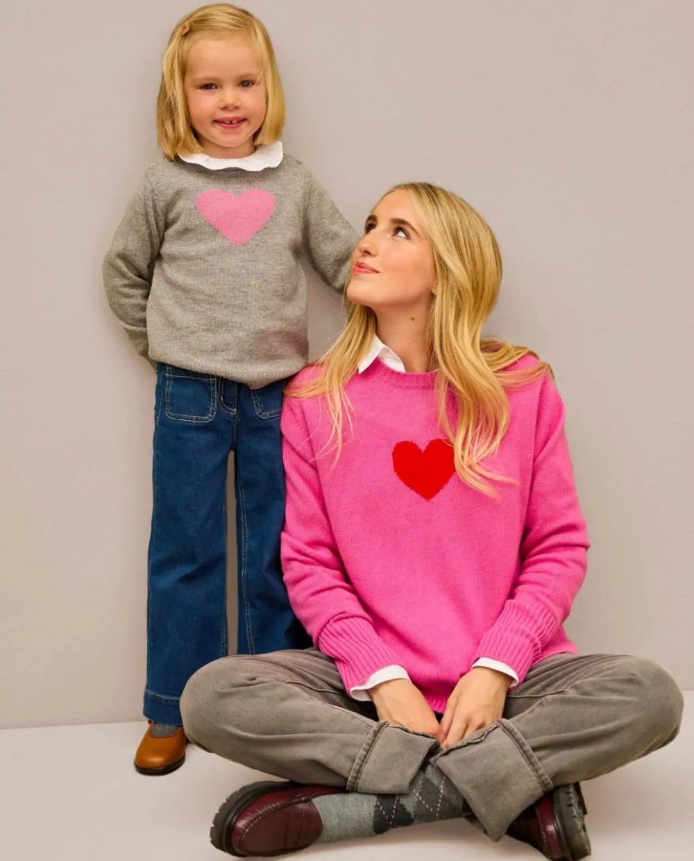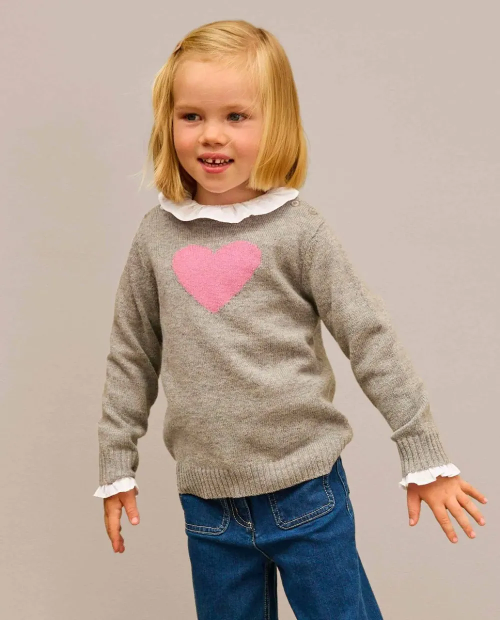 Pull col rond, jacquard coeur au milieu devant. Finition bords côtes. Pure laine d’agneau. 100% lambswool.
