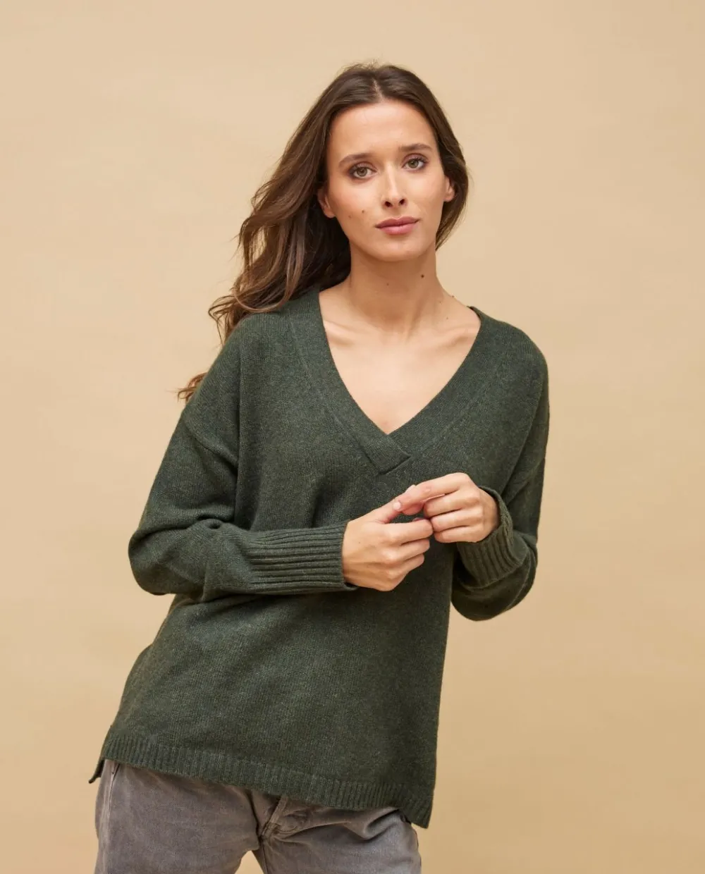 Acanthe Pull loose V croisé 100% cachemire Kaki Best Sale