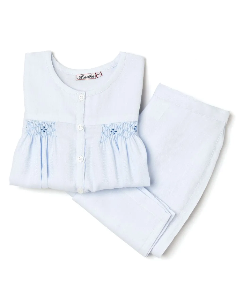 Haut à petits smocks devant, de chaque côté de la patte de boutonnage. Pantalon à taille élastiquée au dos.
