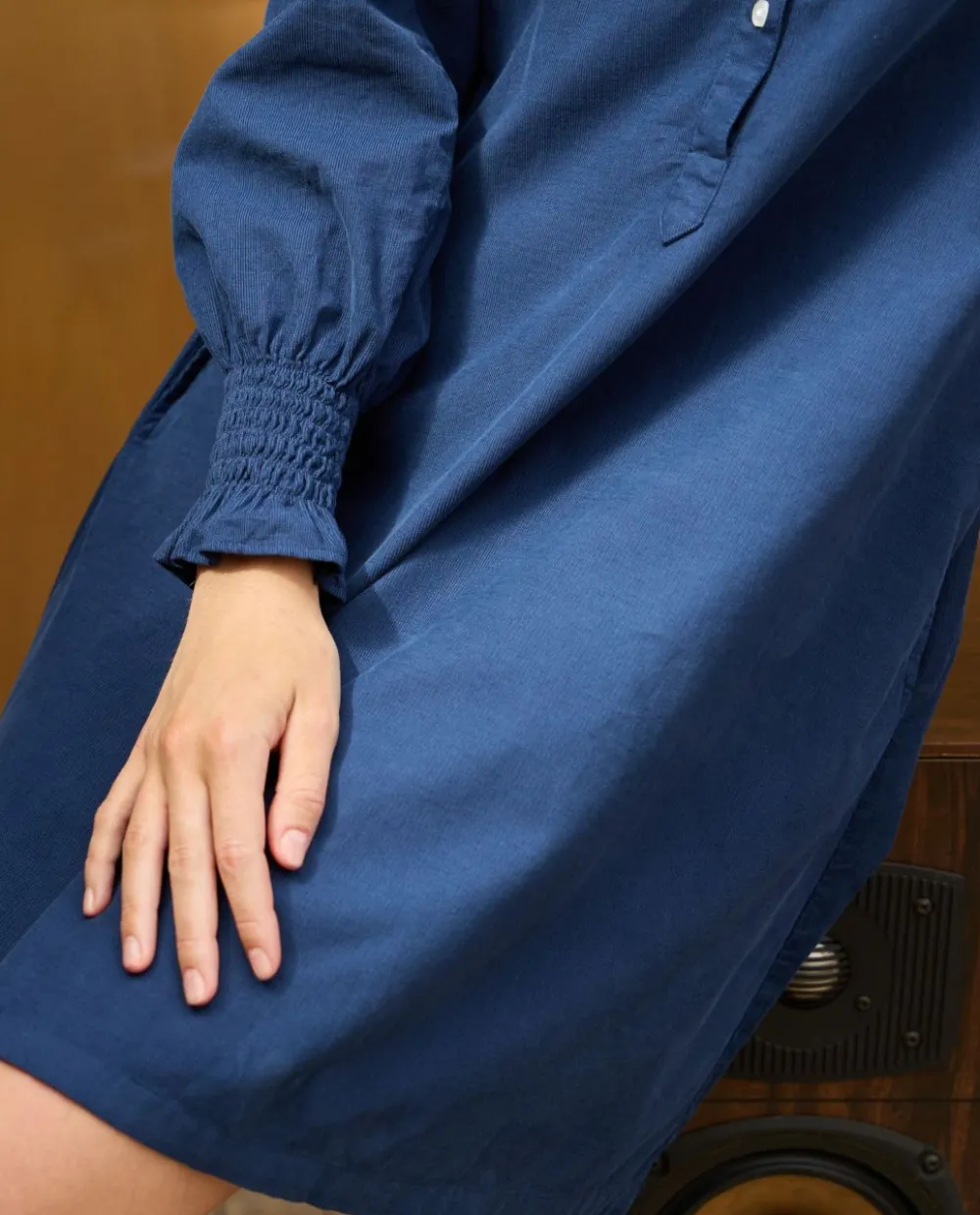 Robe évasée en velours, pli creux dos.Manches longues smockées avec volant. Le mannequin mesure 1m72 et porte une taille 1. 100% coton.