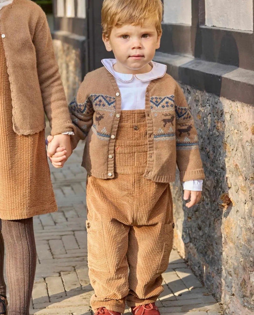 Salopette longue en velours coton. Bretelles boutonnées. Ouvertures côtés et pressions à l’entrejambe. Poche sur la bavette. Doublure en toile de coton. 100% coton.