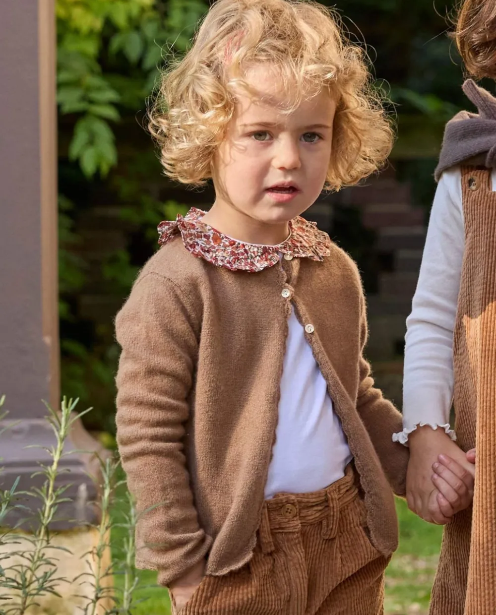 T-shirt col rond orné d’un petit volant en tissu Liberty. Manches longues. Boutonné au dos. Maille jersey coton.100% coton.