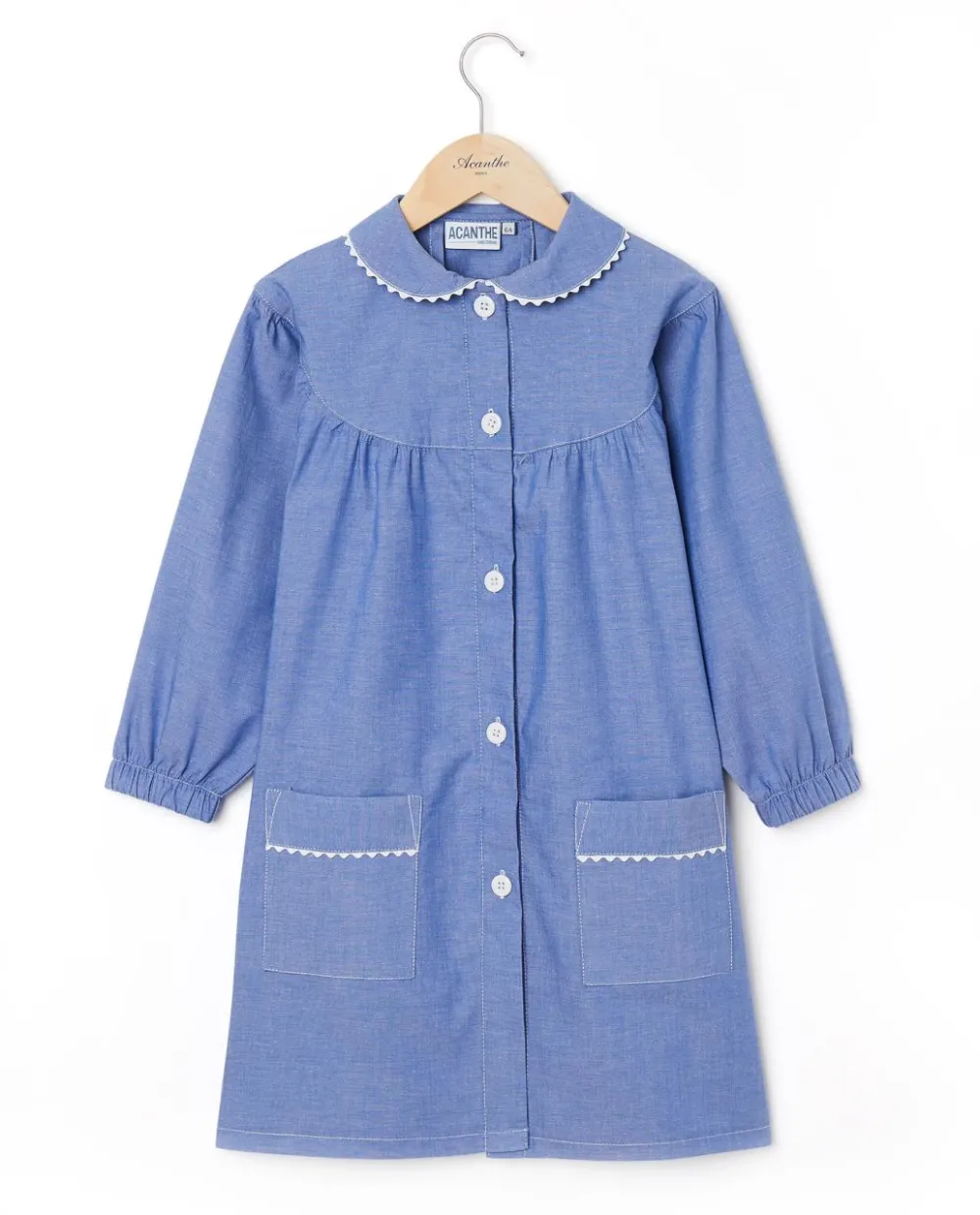 Tablier fille col claudine, boutonne devant, poignets elastiques et poches plaquees. Fintion croquet.