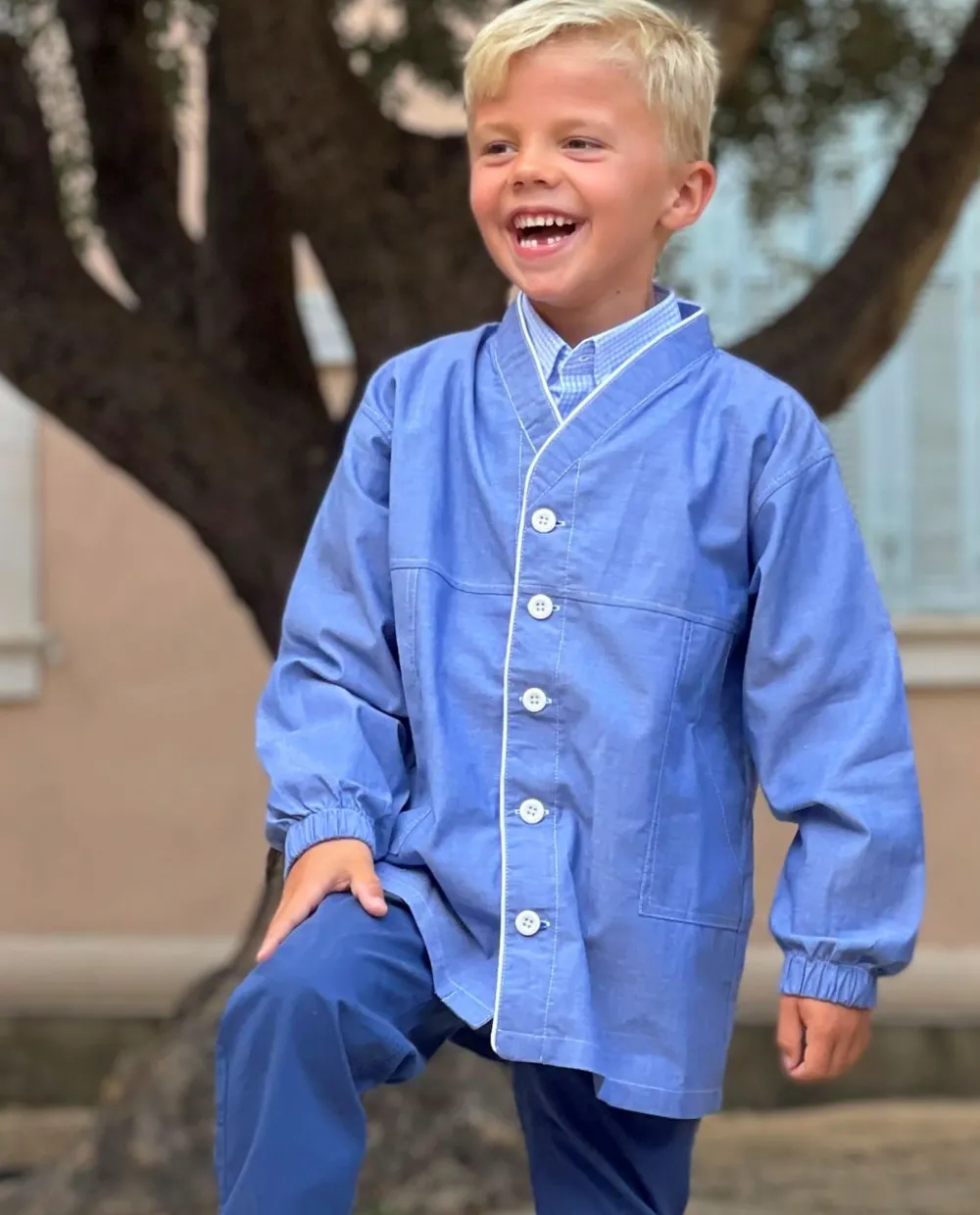 Tablier garcon encolure V, boutonne devant, poignets elastiques et poches plaquees. Finition passepoil.
